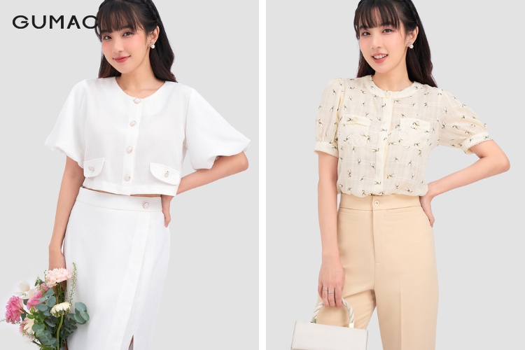 * Áo sơ mi tay phồng cổ tròn: Kiểu dáng trẻ trung, dễ phối với nhiều trang phục khác, thích hợp cho phong cách năng động.
