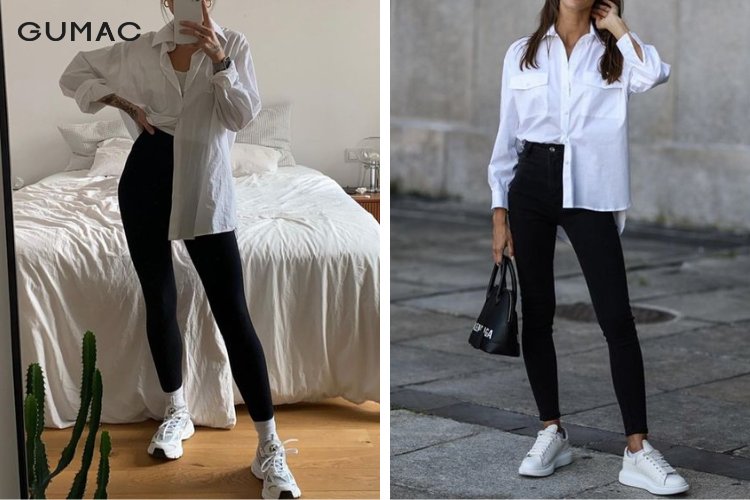 Bạn có thể phối áo sơ mi đuôi tôm với giày cao gót, giày búp bê hoặc giày thể thao tùy theo phong cách. Giày cao gót tạo vẻ thanh lịch, còn giày thể thao mang lại nét trẻ trung, năng động.